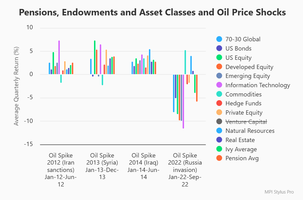 我々は資産クラスの動向および機関投資家ポートフォリオの代理指標(年金基金、大学基金、ならびにグローバル70/30ポートフォリオ)について、イラン制裁(2012年)、シリア危機(2013年)、イラク危機(2014年)、およびロシアによるウクライナ侵攻(2022年)という4つのオイルショック期を対象に比較分析を行いました。